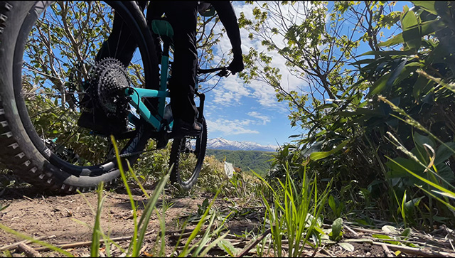今日を存分に楽しまないとと思い、テレマークしてMTBでトレイルライドへ。